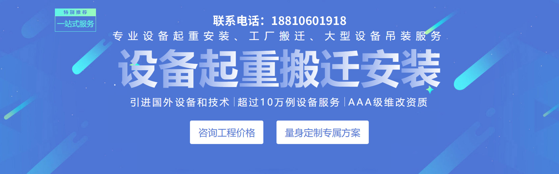 北京久泰起重工程技術有限公司;成立于2006年是一家現代化起重吊裝搬運安裝公司,擅長于工廠設備搬遷、精密儀器無塵車間機械設備移位、起重、吊裝、運輸、搬運、就位、安裝等,公司穩健服務于北京、天津、河北、遼寧等地區,業務輻射全國。